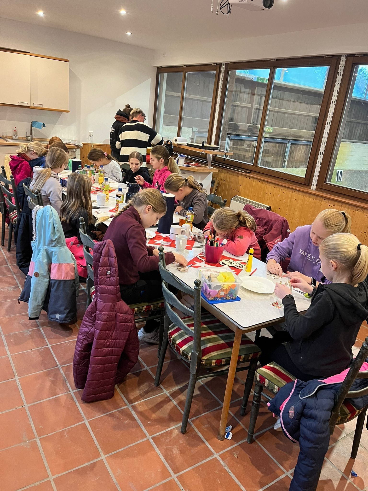 Bei leckeren Waffeln und warmen Kakao wurde fleißig gebastelt und kreativ gearbeitet. Es wurden Hufeisen bemalt und verziert. Danach stand etwas Aktivität auf dem Programm. Die Kids durften sich in 4er Gruppen eine Quadrill mit Musik und Steckenpferd überlegen und vorführen.