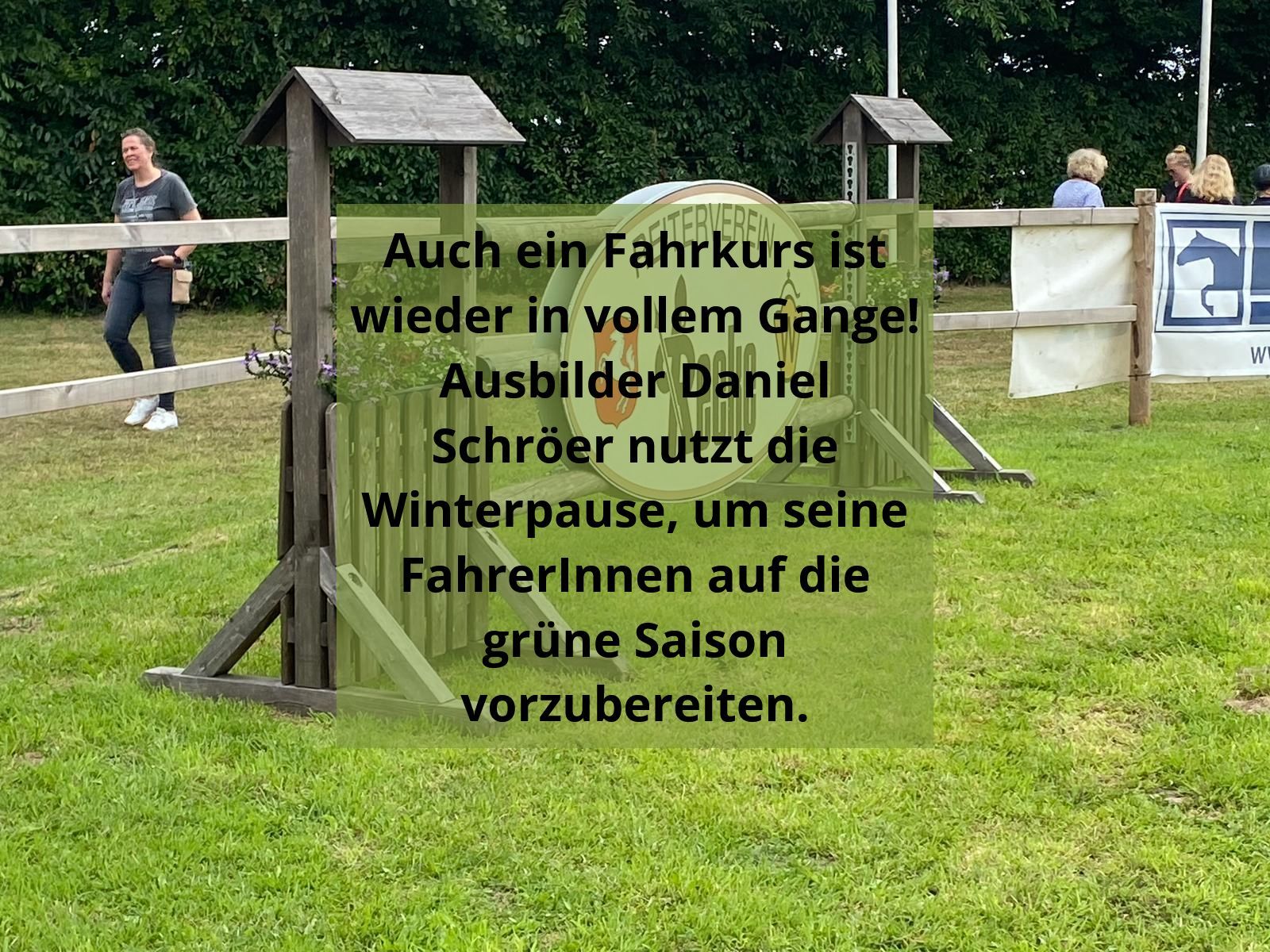 Insgesamt machten sich neun Teilnehmer gemeinsam mit Daniel Schröer und Ditmar Hegekötter auf den Weg in die Welt des Fahrsports. Acht von ihnen machten das Fahrabzeichen der Klasse FA5 und eine Person das Fahrabzeichen der Klasse FA4, mit dem Schwerpunkt Dressur. Einmal por Woche fand theoretischer Unterricht statt und an den Wochenenden war das Fahren angesagt.
