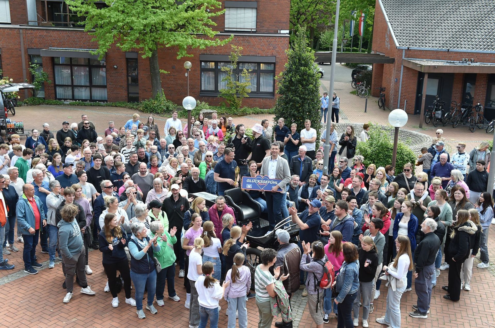 Die Herausforderung bestand darin, mit 15 Mitgliedern eine Kutsche um das Recker Rathaus zu ziehen. Dabei mussten mindestens 100 Zuschauer anwesend sein, um die Aktion zu unterstützen. Dank des großen Zusammenhalts und der tatkräftigen Unterstützung aus der Region konnten wir die Aufgabe erfolgreich erfüllen.